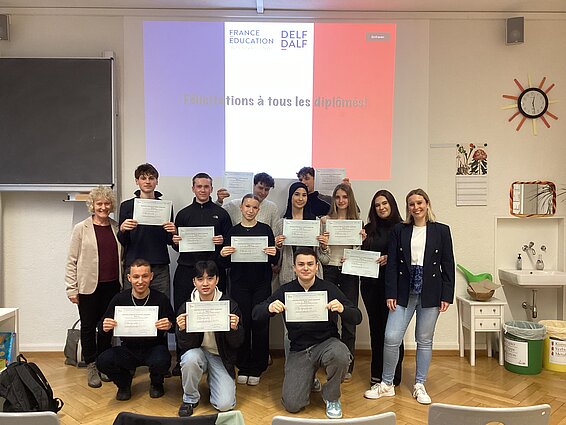 Nach einer herzlichen Ansprache der stellvertretenden Schulleiterin Michaela Lex wurde den Schülerinnen und Schülern schließlich das DELF-Diplom von ihrer ehemaligen Fachlehrerin Alexandra Fahrer überreicht.