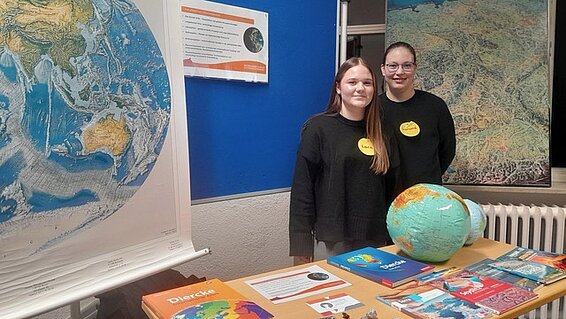 Engagierte Schülerinnen beantworten Fragen am Stand des Wahlpflichtfaches Wirtschaftsgeografie.